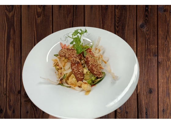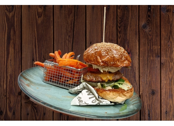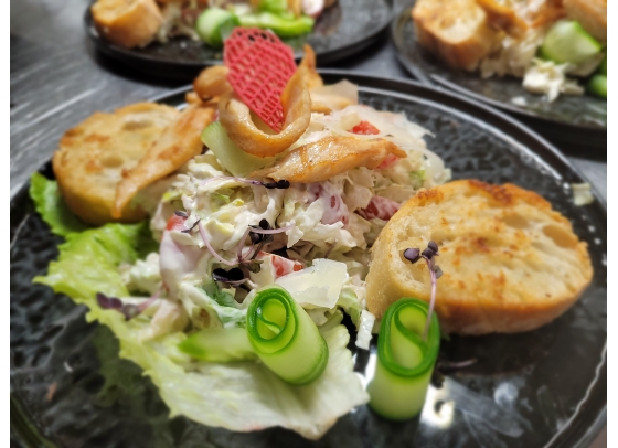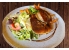Mozzarellával és pácolt paradicsommal sült jérce édesburgonya hasábbal és bazsalikomos házi majonézzel, kevert saláta kaavalkáddal