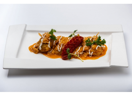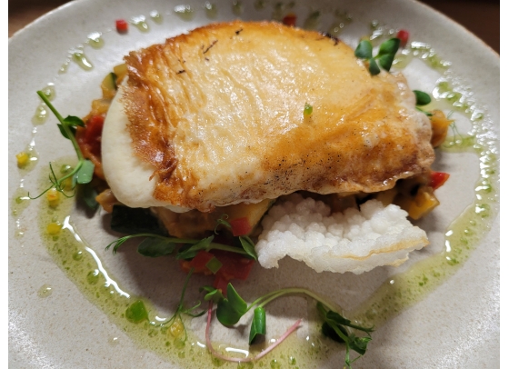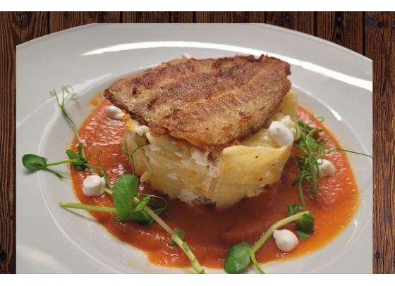 Rosé kacsamell burgonya fánkkal, lilakáposzta krémmel, aszalt szilva raguval