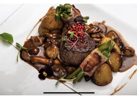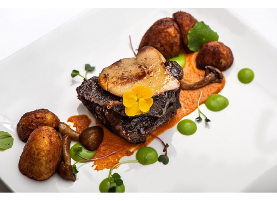 keserű csokoládé, zöldbab rőzse, parázsburgonya és vadgomba ragu