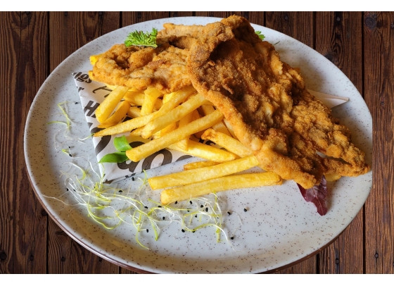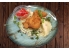 préselt csirkecomb filé rántva, vajas burgonyapüré, lilahagymás paradicsom