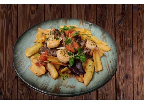 picanha 250gr, fokhagymás-vajas garnélaragu, koktélparadicsom, hasábburgonya